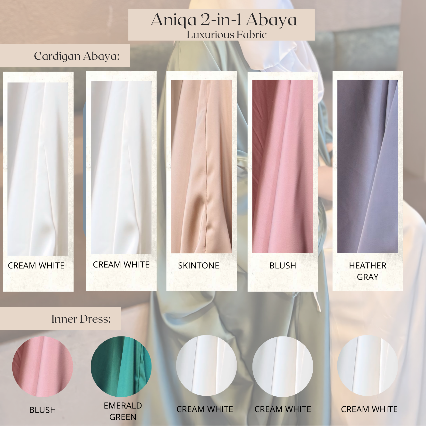 Aniqa Abaya is a stunning two-piece design that features a sleeveless inner dress paired with a batwing-style outer abaya.